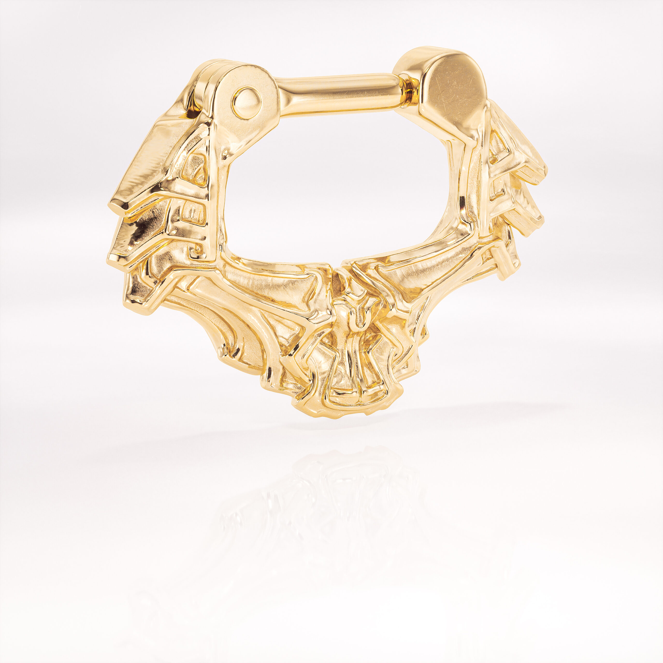 The Articulated Spine in brilliant 18K Gold PVD is the epitome of structural elegance. This clicker features bold, segmented mechanical details coated in a highly polished, resilient 18K Gold PVD finish. It’s a clean, futuristic statement piece, crafted from durable, high quality steel, offering radiant, uncompromising style.